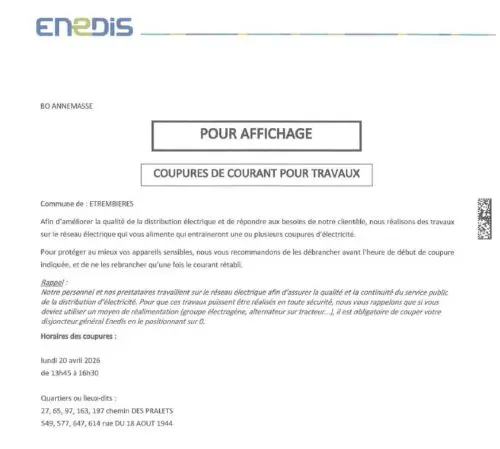 Enedis vous informe qu’une coupure de courant aura lieu le lundi 20 avril 2025