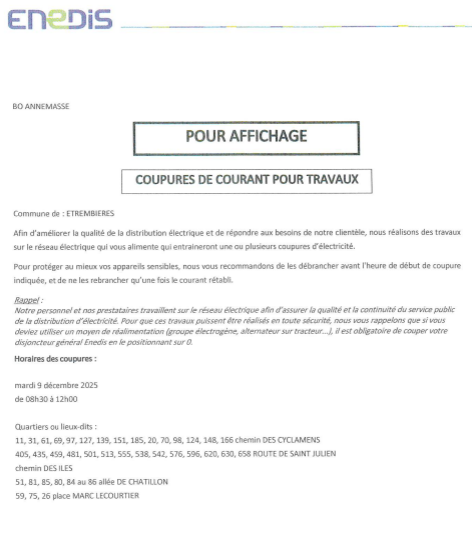 Enedis vous informe qu’une coupure de courant aura lieu le mardi 9 décembre 2025.